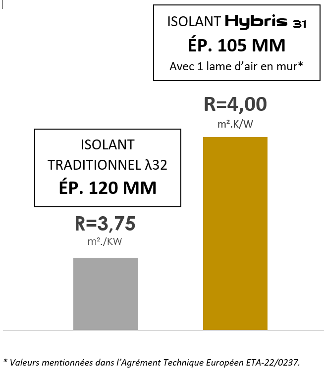 Par exemple, en épaisseur 105 mm, Hybris31 offre un R=4,00 m².K/W avec une lame d’air en mur. Une résistance thermique supérieure aux standards du marché :