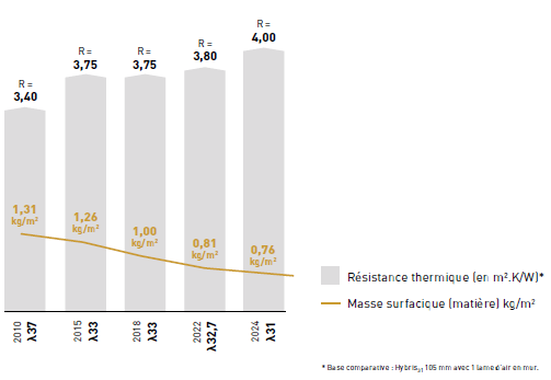 Au cours de ces 15 années d’optimisations permanentes, sa conductivité thermique a pu être améliorée, en passant de λ=0,037 W/m.K à λ=0,031 W/m.K tout en réduisant la quantité de matière utilisée (masse volumique moindre).