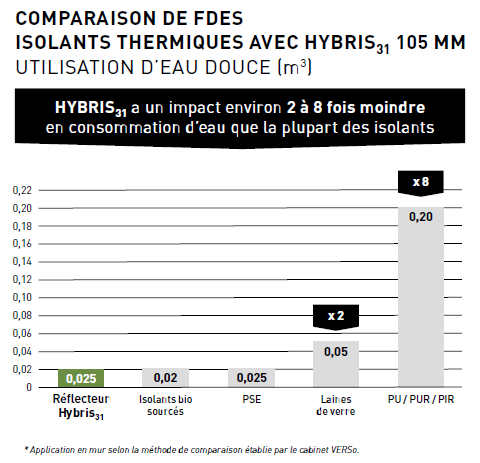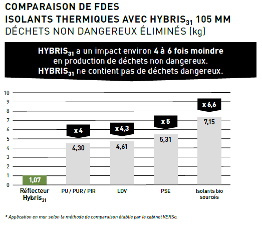L’éco-conception de l’isolant Hybris31 se traduit également par une analyse de cycle de vie (ACV) décrite dans les FDES (Fiches de Données Environnementales et Sanitaires) aux très bonnes valeurs, à la fois sur le bilan carbone par rapport aux réglementations comme la RE 2020, l’utilisation d’énergie, d’eau douce et la génération de déchets. La capacité de l’Hybris31 à se positionner aussi bien sur l’ensemble de ces critères est une singularité sur le marché des isolants.