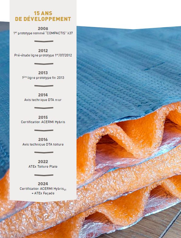 L’isolant HYBRIS fête ses 10 ans dans sa version commercialisée certifiée ACERMI, mais il est le fruit d’un travail beaucoup plus long si l’on intègre la date des premiers concepts, puis prototypes et préséries. Il aura fallu plus de 15 ans de développement pour aboutir à sa version actuelle.