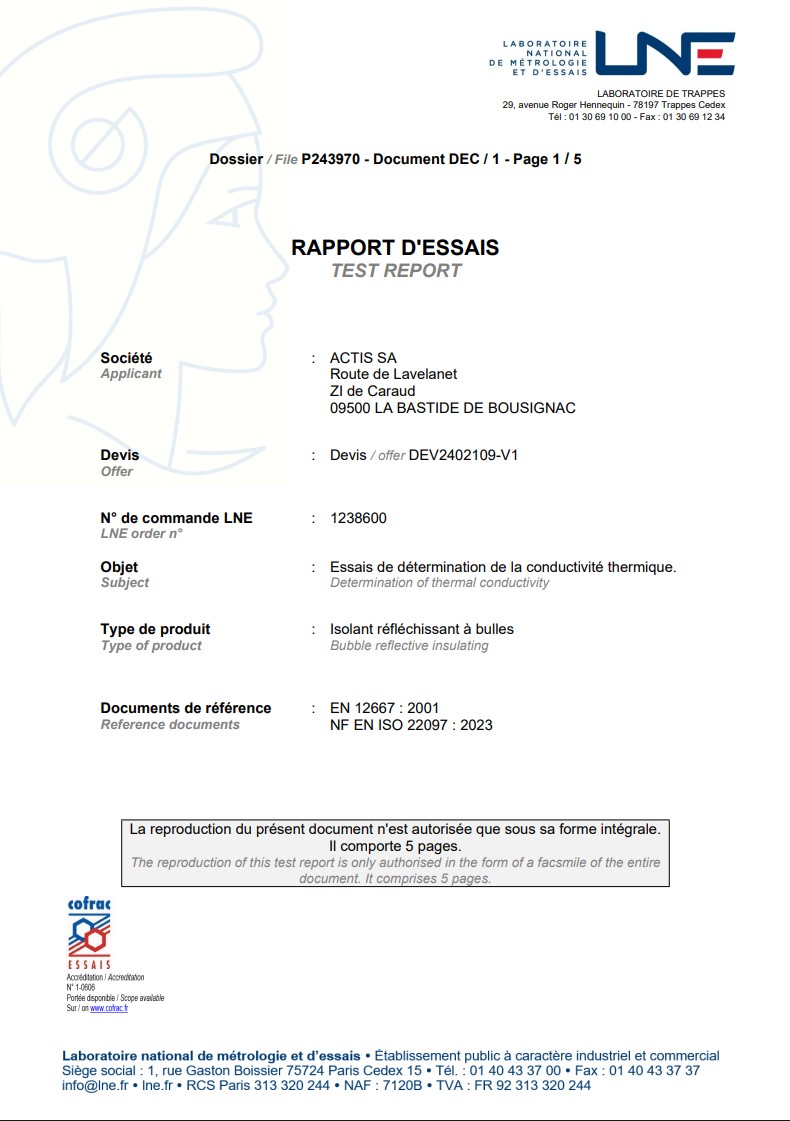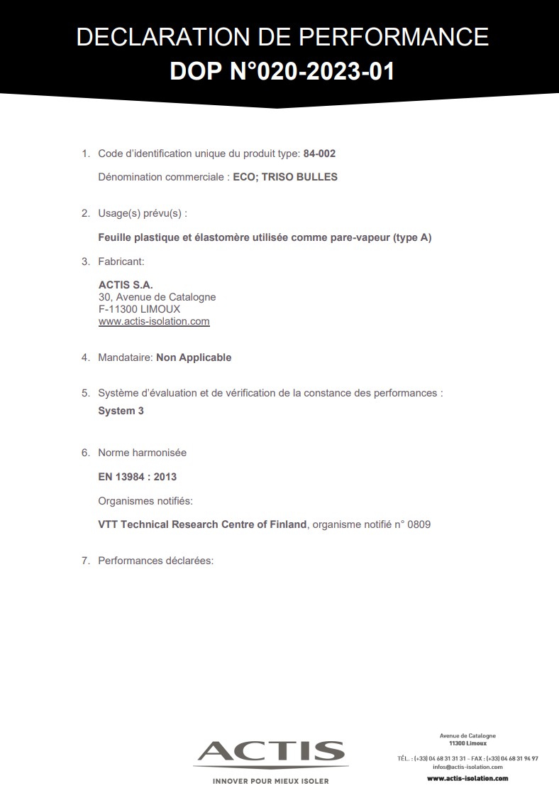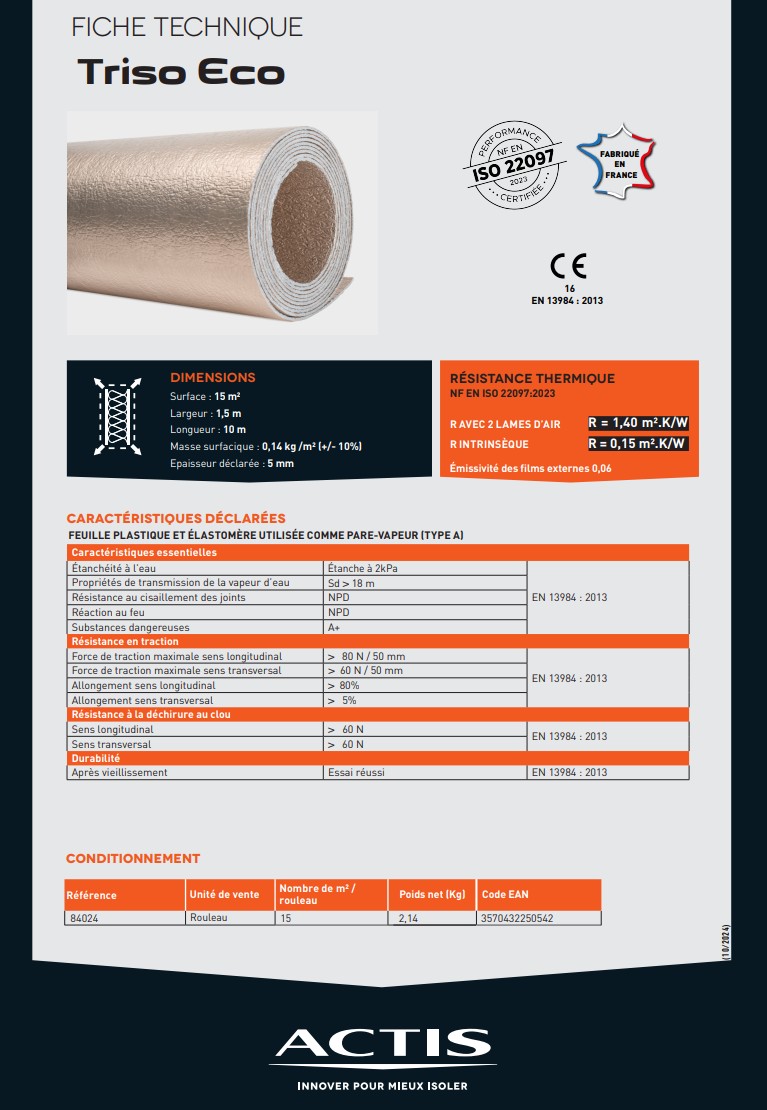 TRISO-ECO est un isolant réflecteur polyvalent et économique avec une performance thermique, certifiée selon la norme internationale NF EN ISO 22097:2023 : R = 1,40 m².K/W sans lame d’air.